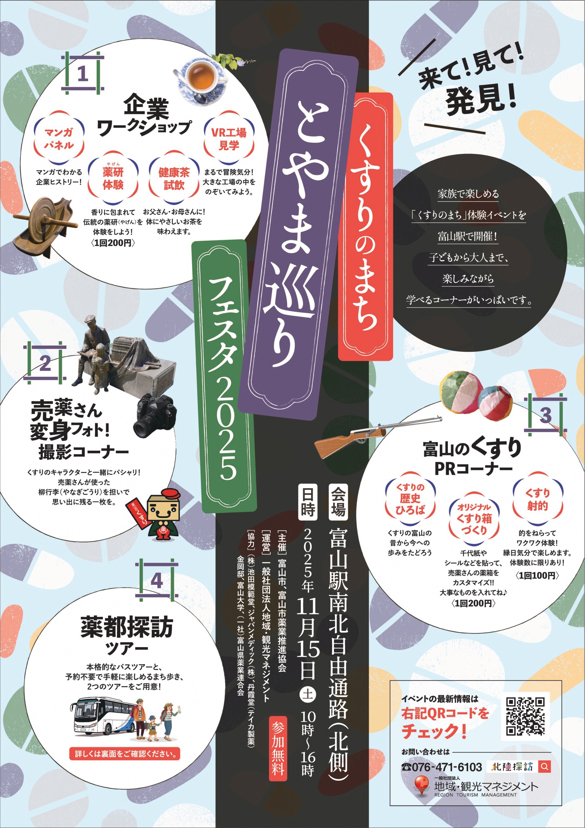 このたび、富山市と富山市薬業推進協会では、子供から大人まで、「くすりのまち富山」を学び、楽しめるイベント、「くすりのまちとやま巡りフェスタ2025」を開催いたします。